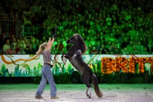 Een moment waar vele fans op gewacht hadden. Britt en haar mini pony Teddy kwamen de baan in. Britt doet vrijheidsdressuur met deze bijzonder leuke pony. Bijzonder: Dit was de eerste show van Teddy. Samen lieten ze diverse oefeningen zien en ook legde Britt uit hoe ze deze oefeningen aanleert thuis. Mooi om de band tussen Britt en deze pony te zien. Vermoedelijk zullen veel pony’s van de fans van Britt de komende tijd ook aan vrijheidsdressuur onderworpen worden …… “Alles lukt, als je maar geduld hebt” aldus Britt.