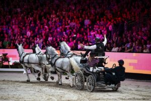 Benthe van Paardenpraat TV opende het tweede deel van show. Ze was niet alleen, niemand minder dan voormalig Wereldkampioen IJsbrand Chardon kwam in de ring. Natuurlijk niet alleen, samen met één van zijn schitterende vierspannen. Tot groot plezier van de fans nam Benthe achterop het rijtuig plaats en IJsbrand zou IJsbrand niet zijn als hij niet vol gas door de baan ging ……..