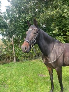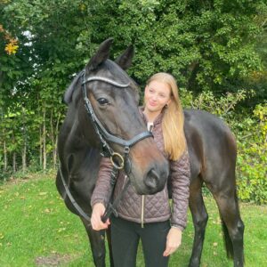 “Over mijn pony. Lynn is een zwart bruine E pony van negen jaar. Het is een merrie en ze is heel lief en heel braaf. Ik heb haar iets meer dan een jaar. We springen nu 90 centimeter en later dit indoor seizoen zullen we de overstap naar het 1.00 meter maken.”